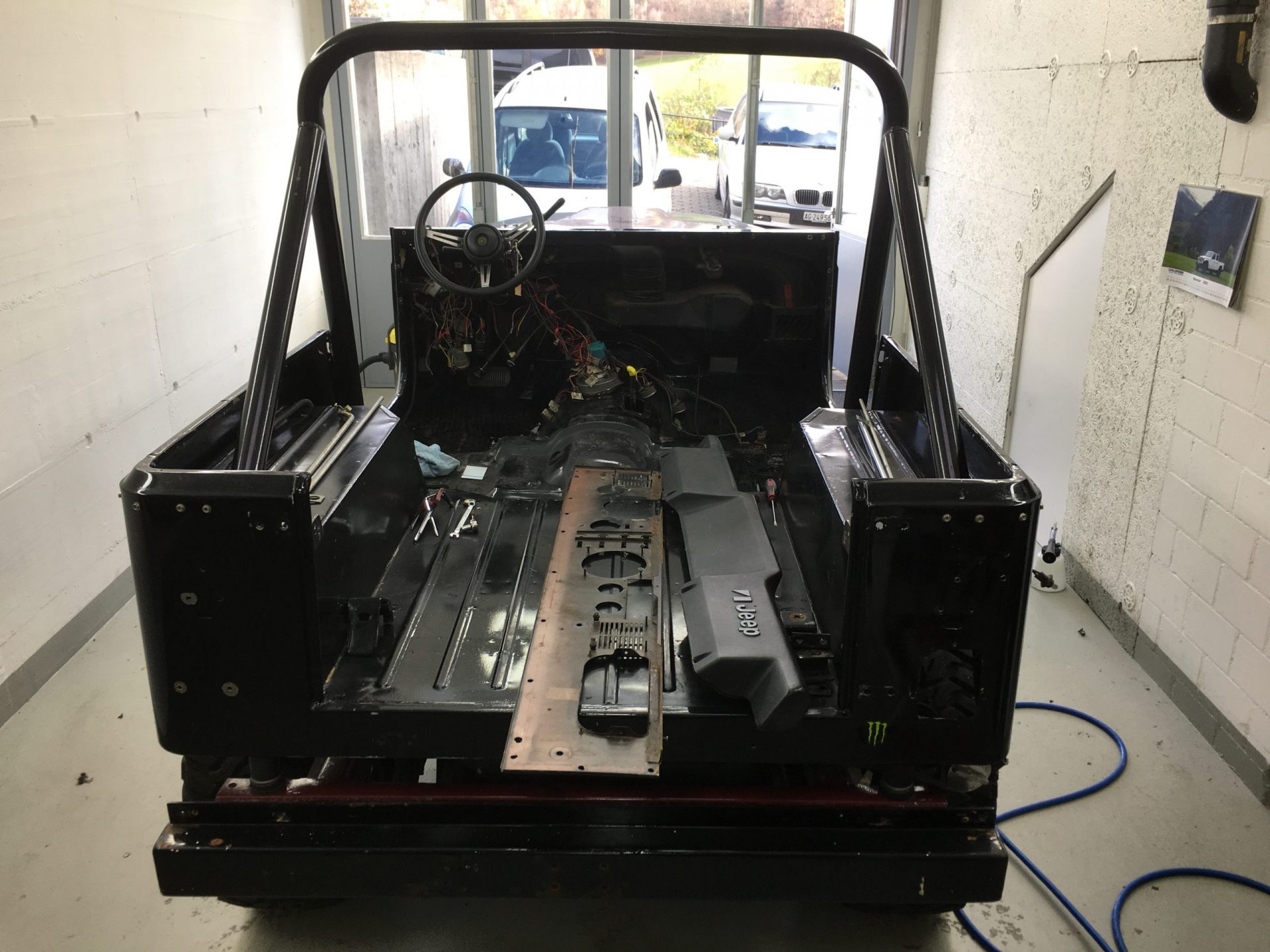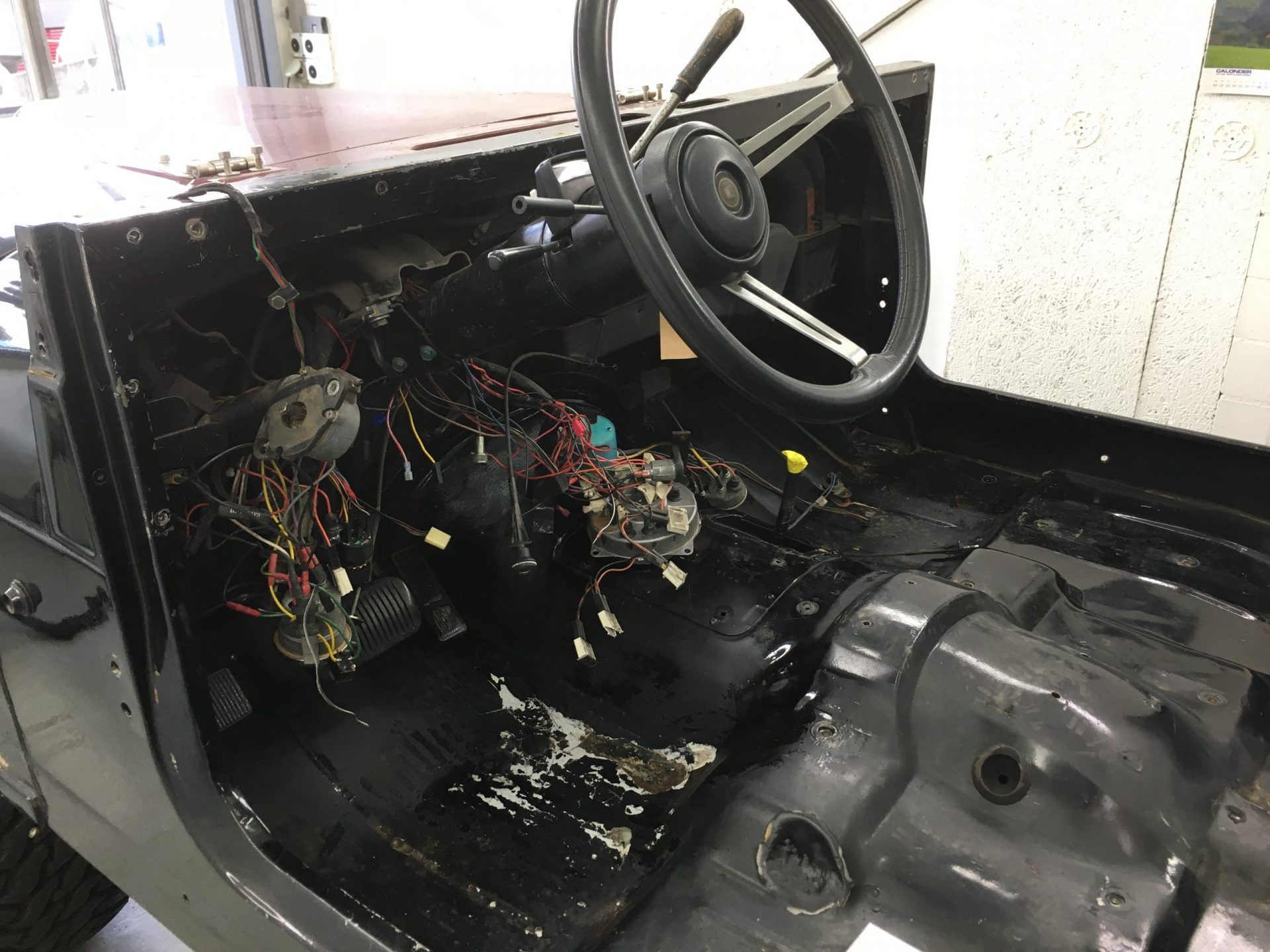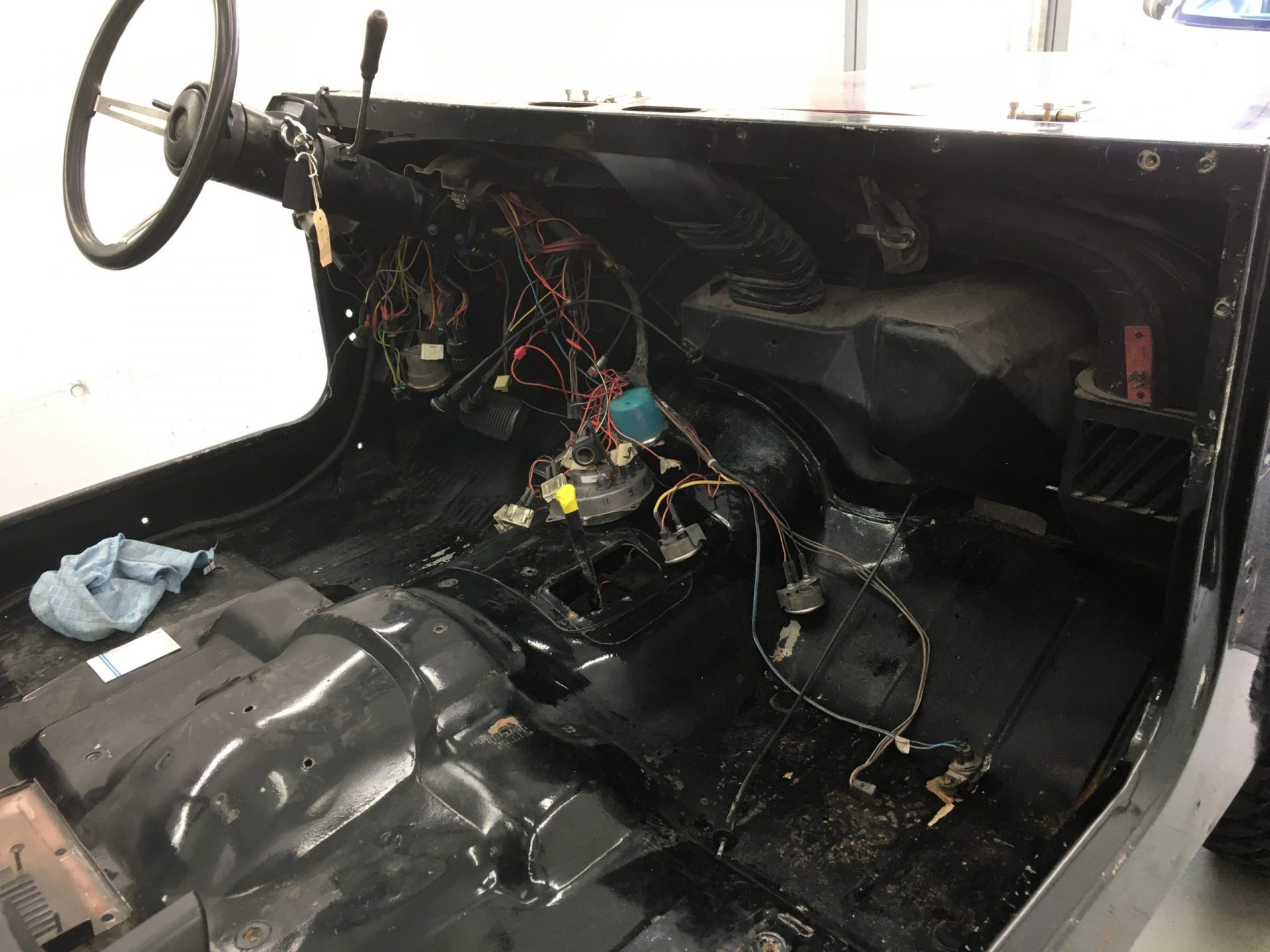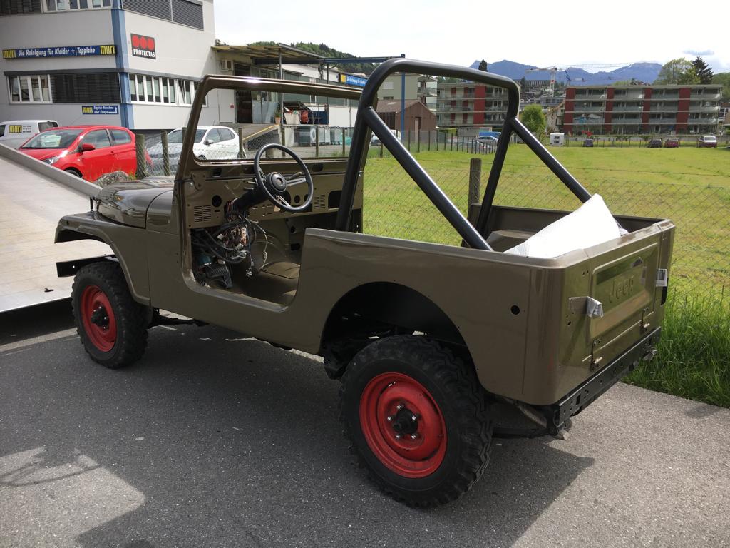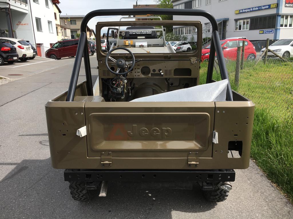 Die Restauration ist in vollem Gange. Der CJ-7 wurde bis aufs Chassis komplett zerlegt, entrostet und die überschüssigen, nicht benötigten Löcher zugeschweisst. Zudem wurde die Karrosserie ausgebeult und in Stand gestellt. Das ganze Armaturenbrett, inkl. Heizkasten wurde ausgebaut und separat restauriert. Als nächstes geht das Fahrzeug zum Lackierer……..Bilder folgen!